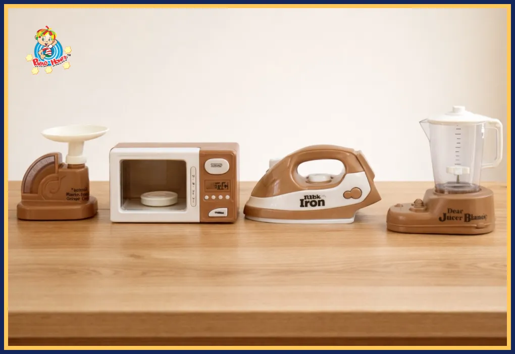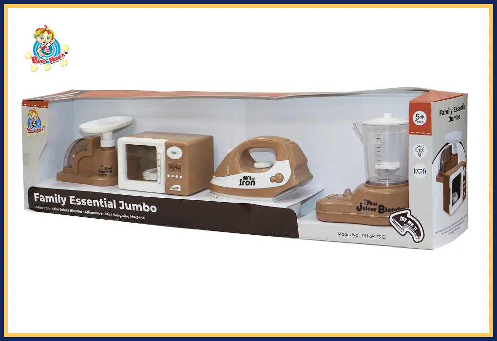 This jumbo combo comes with a microwave, mini iron, mini juice blender, and mini weighing machine in blue and brown. Kids can press the buttons, see the lights, and enjoy all the moving parts while playing. They can explore each appliance and try out different fun activities. They can cook in the microwave, mix in the blender, weigh items, and iron tiny clothes. It keeps little hands busy and makes playtime full of fun. With so many appliances, kids can enjoy different home activities and use their imagination. This set is great for hours of creative and happy play.