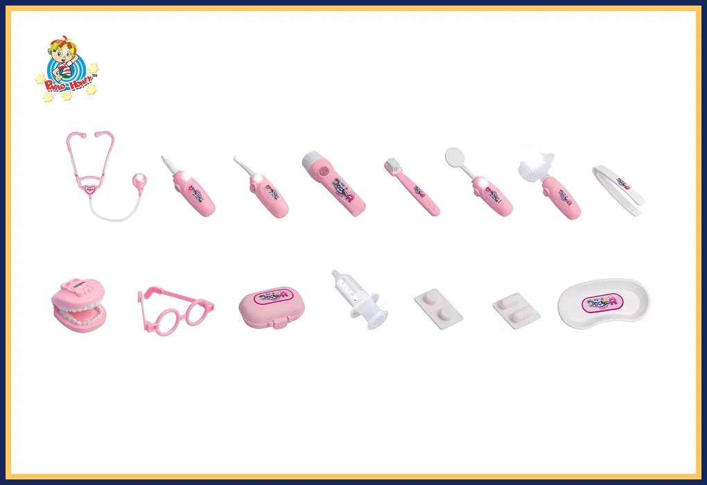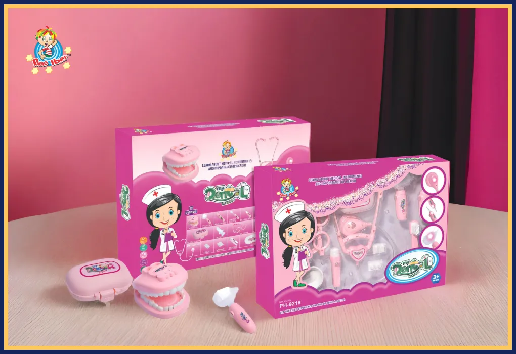 This is a fun doctor play set for kids who love role play and learning. It includes many dental and medical tools such as a toothbrush, denture, mouth mirror, dental drill, syringe, medicine box, tablets, flashlight, and more.Kids can act like a dentist, check teeth, clean them, and help patients feel better. This set helps children learn about dental care and good habits in an enjoyable way.